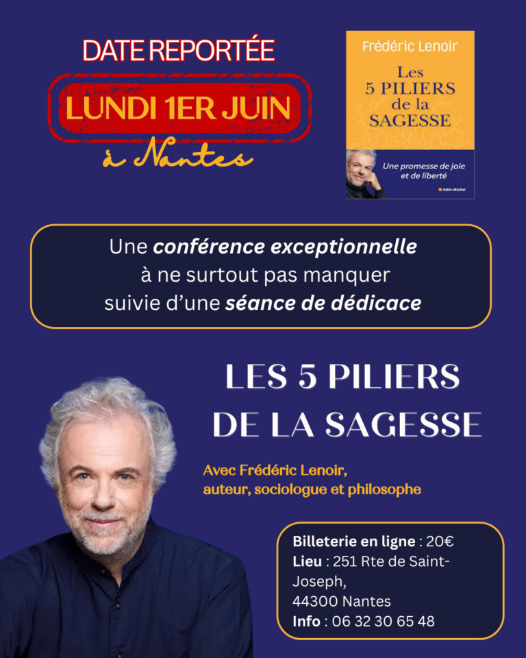 NOUVEAU RENDEZ-VOUS : LUNDI 1ER JUIN 2026 à 19h En raison d’une indisponibilité indépendante de notre volonté, la conférence de Frédéric Lenoir, initialement prévue le 5 mars, est reportée au lundi 1er juin 2026 à 19h. Cette rencontre se tiendra autour du thème annoncé, inspiré de son dernier ouvrage Les 5 piliers